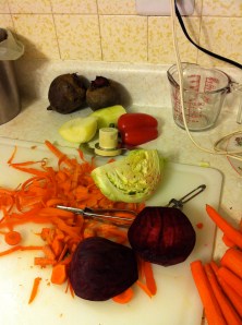 4. Peel and grate 6 large carrots; 3-4 large beets; saute in butter or oil, until one color (they’ll turn purple). Add to potato/cabbage kettle.