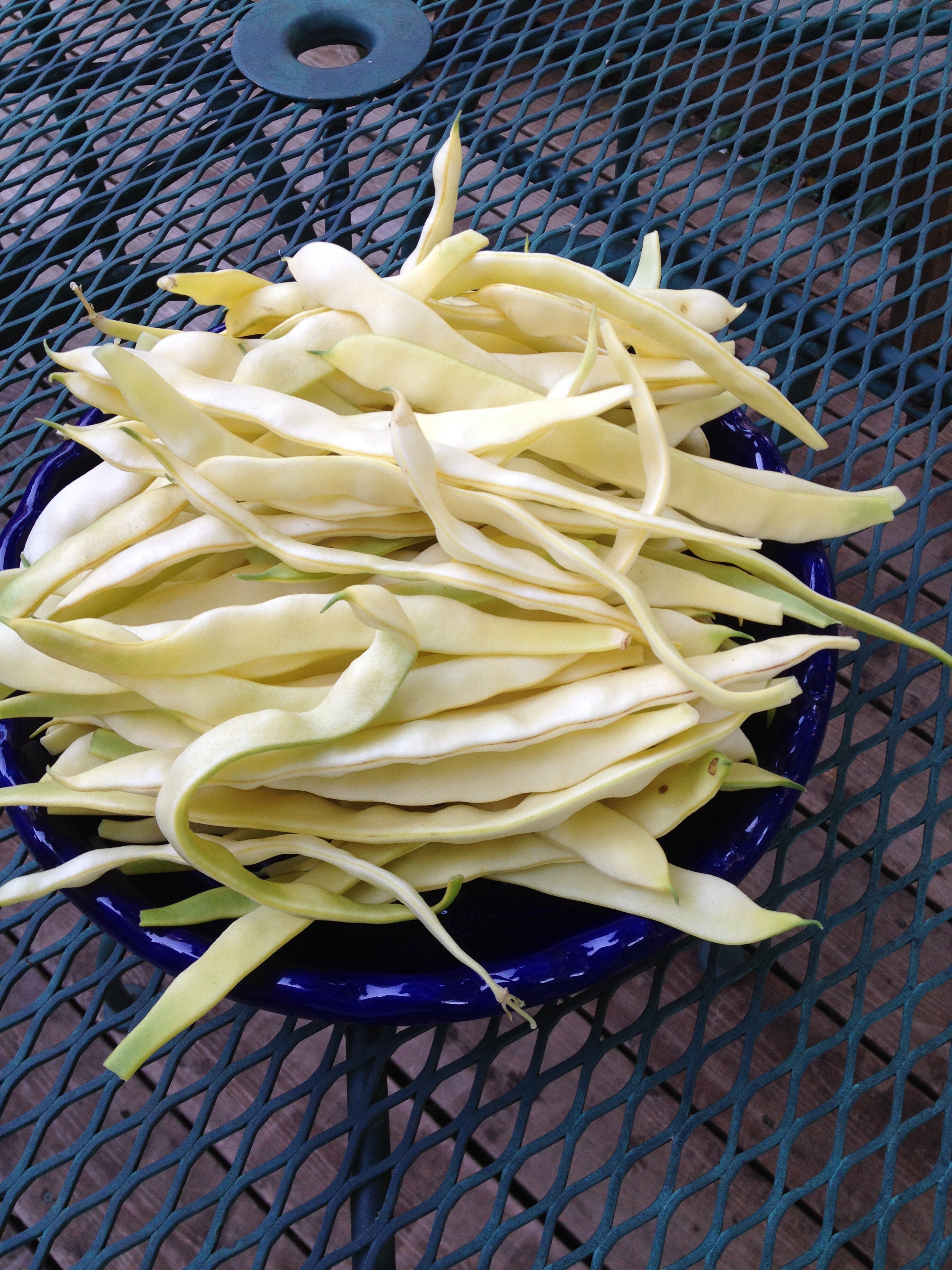 Over the past months, the beans have grown and filled in the structure better than I could have imagined, and it’s a pretty cool space to hang out while picking beans. And training the vines? Therapeutic. The yurt also makes harvest a breeze, because you can see and reach everything. We’ve started picking, and it’s clear that the bean harvest is going to be hard to keep up with. I’ve got two types of beans in the yurt, a blue lake green pole bean, and a yellow bean called Gold of Bacau–a bean I grew last year that grew wonderfully. I got the beans from Seedsavers last year, and let a bunch grow until dry last fall, to save some to grow this year. The plants are the same as last year–vigorous and heavy producers of long, flat yellow beans. They are too thin to be boiled or steamed, and are best eaten in a vegetable stir-fry on the grill (recipe follows). They also work well with an Asian inflection.
