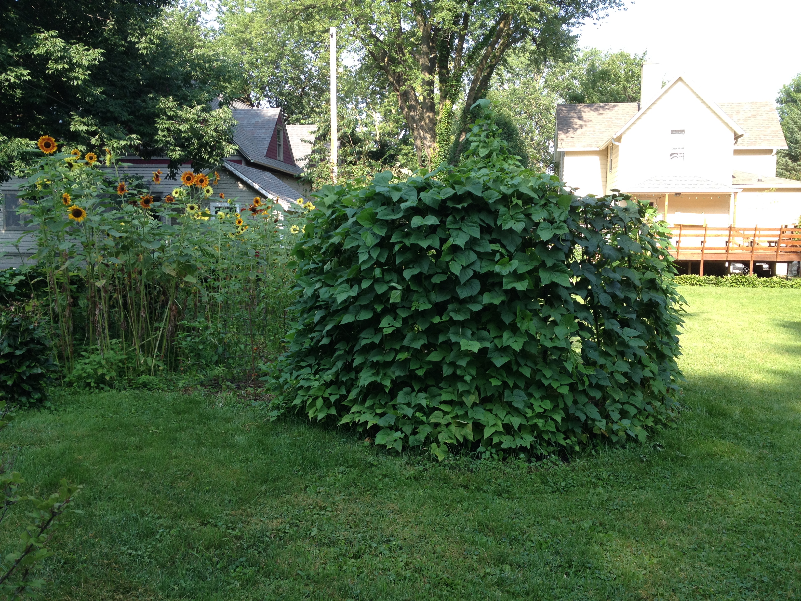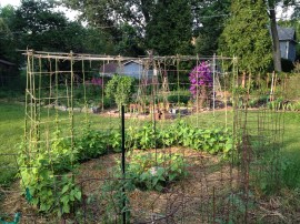 Part of my obsession with beans has to do with the structures I build for them and any other vining vegetable–cucumbers, squash, melons, and gourds to name a few. I’ve loved figuring out ways to build trellises from pretty much any kind of material that works, from bamboo to fallen branches, from hog wire to store-bought garden poles. I have always been inspired by the structures I saw when growing my first garden in the community plots at Buckeye Village, the married-student housing complex at Ohio State University. The residents there were from all over the world–China, Korea, Uganda, Hungary, and on and on, and the field where we had our plots was a real patchwork of global gardening, with all manner of vegetable and structure. Given that space was an issue, the trellis-system was practical, since training plants to go up conserves valuable ground. I’ve gardened with that philosophy since, and train anything that climbs up on an evolving system of trellises. Last year for some green beans I used a commercial bean trellis, a conical structure, which worked well, until the vines hit the top, grew together, and kept twisting and entwining themselves into an almost impenetrable mass. I still harvested pounds and pounds of beans, which got me to thinking this winter that, with the right kind of structure, I could grow even more in the same space. This spring I tilled a new area in my yard for