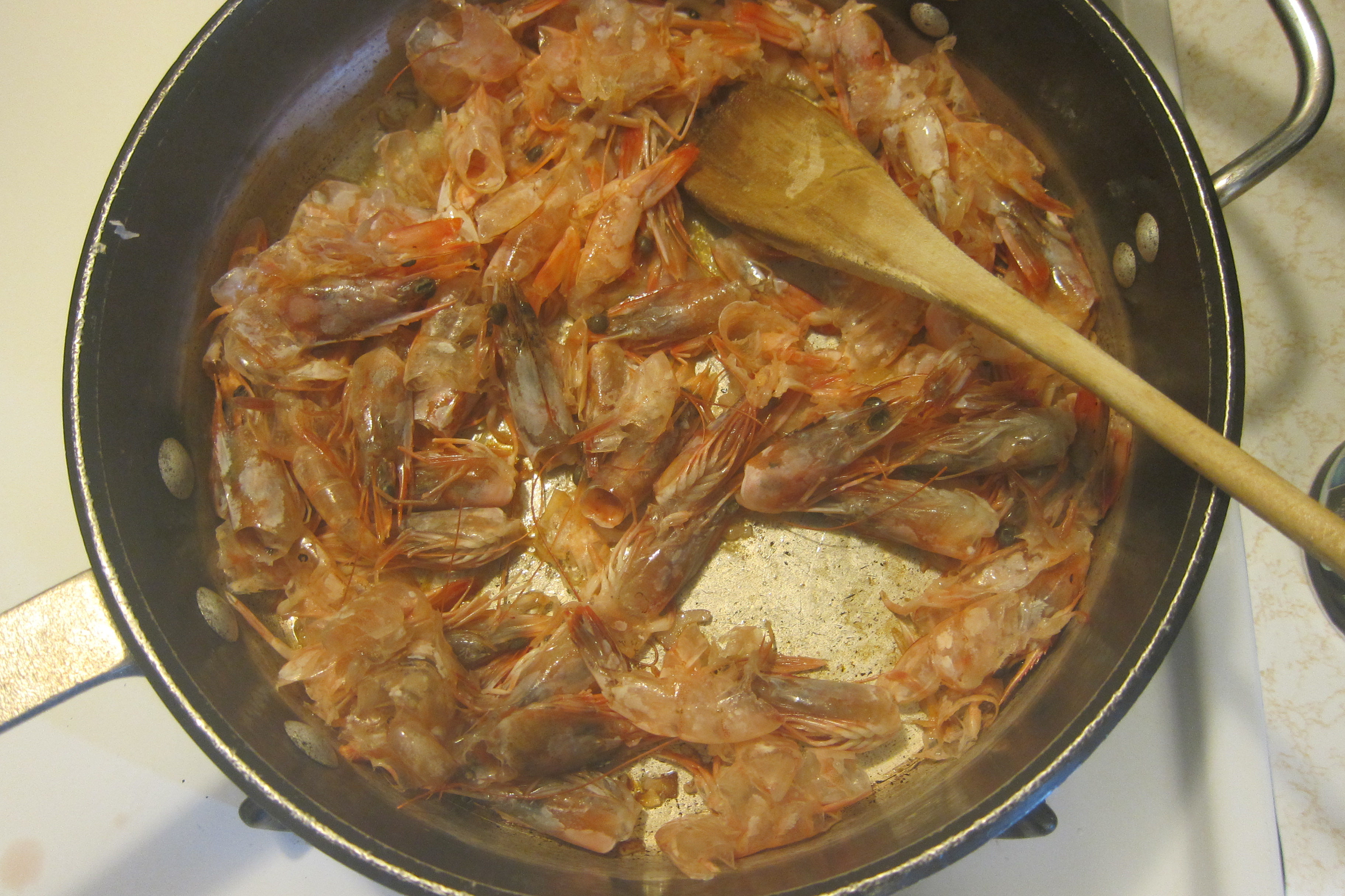 I’ve been shopping at La Tapatia in Des Moines for years, and almost every time I go there, I walk by the butcher counter, which runs almost the whole length of the back wall, and check out what kinds of things they have that you can’t easily get anywhere else. It’s a great place for things like oxtail, lots of cuts of beef, chicken feet, and chicherones, but what I’ve wanted to buy for a long time is a pile of the camarons con cabeza, or shrimp with heads on. I didn’t know just what I’d make when I bought them, but as I drove home and brainstormed about recipes, I decided I’d make a risotto, and use a shrimp stock made from the heads and shells. I hadn’t made a stock like this in years (and then mainly in restaurants), so I was looking forward to what I could put together. The finished stock made me smile when I tasted it; it was so good. And it made a pretty amazing risotto.