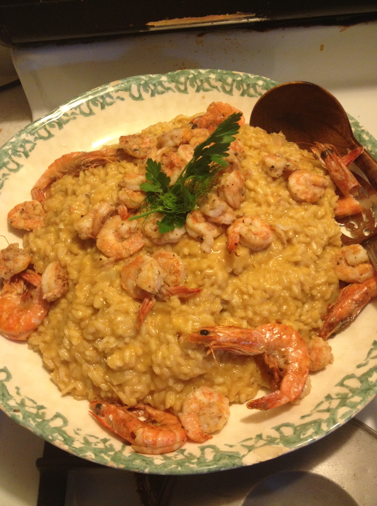 To serve, pour the risotto out in a large shallow platter, and mound the grilled shrimp on top. For garnish, I left six shrimp with shells and heads on, and cut through the back of the shell to devein them. This recipe serves 5-6.