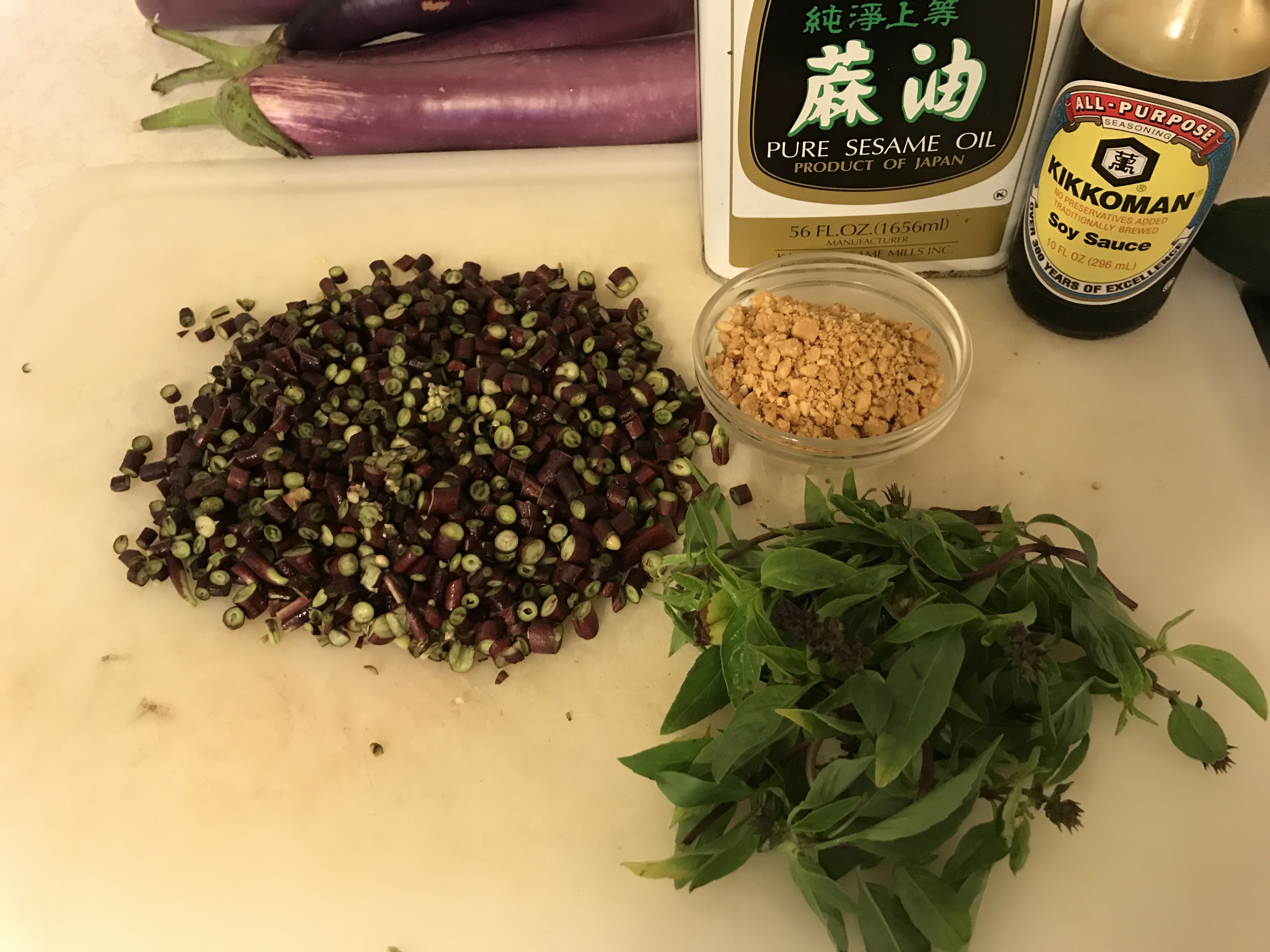 This dish is simple, and surprisingly good–one of those dishes that makes you raise your eyebrows when you first try it. The Chinese Red Noodle Bean is a red version of the long bean, which is a popular vegetable in Asian cooking. I first grew the green version in 2020, with some success, and last summer I decided to try Chinese Red Noodle Bean, from Baker Creek Seeds. It grew spectacularly, and produced lots of beans. They grow in twos, sometimes threes, and they’re among the few purple vegetables that retain their color when cooked. My friend and colleague Yujing shared this recipe with me during a workshop in Grinnell College’s Global Kitchen in summer of 2021.