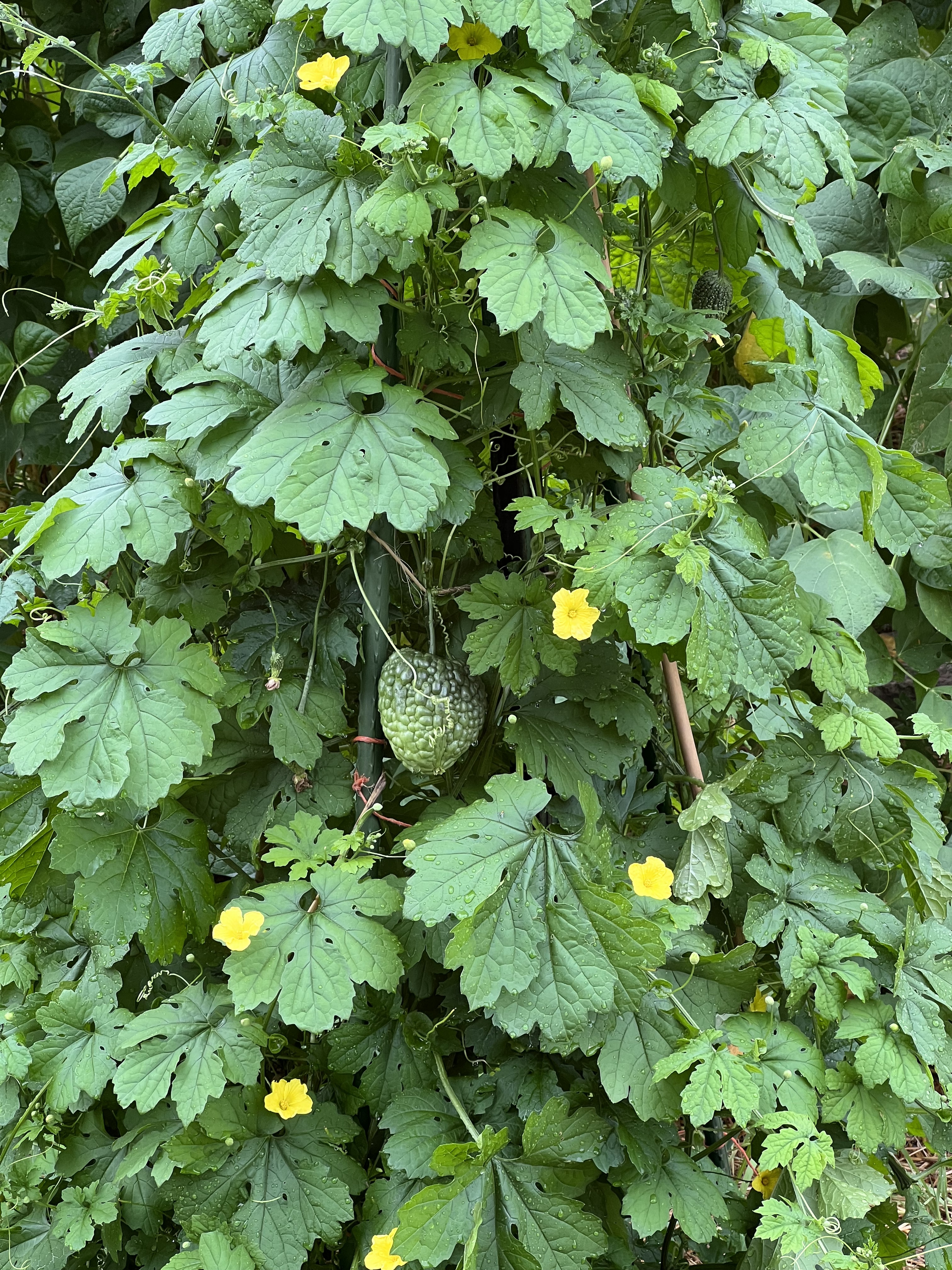 My good friend Andrew Hsieh first introduced me to this Asian vegetable, also known as a bitter gourd. Aptly named, bitter melons are intensely bitter, and an acquired taste. They grow well in Iowa, and the plant consists of a beautiful vine with delicate yellow flowers and serrated leaves. They are harvested when green (or white, the color of a variety from Okinawa that I’m growing this season), and ripen into a brilliant cadmium orange. As they it ripen, they split open from the end, revealing bright red seed globules. The red part coats the seeds, and is intensely sweet.